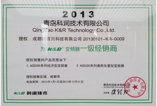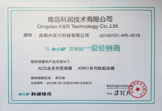 青島科潤(rùn)(K&R)產(chǎn)品代理銷(xiāo)售授權(quán)證書(shū)